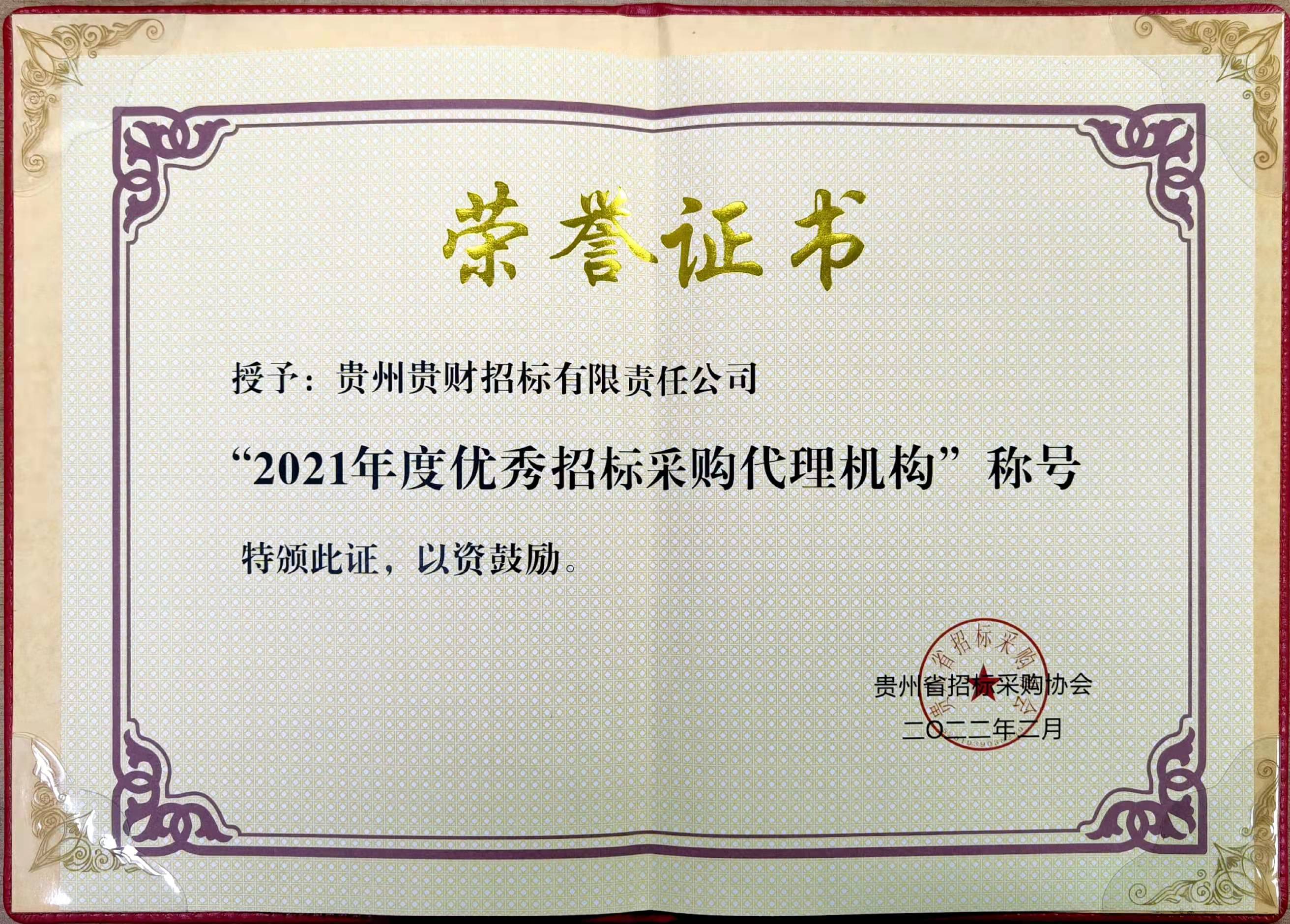 2022年2月18日,貴財招標(biāo)憑借長期以來的專業(yè)水平、誠信口碑和廣大客戶的大力支持,再次榮獲貴州省招標(biāo)采購協(xié)會頒發(fā)的“2021年度優(yōu)秀招標(biāo)代理機(jī)構(gòu)”稱號,這是自2018年評選活動舉辦以來,公司連續(xù)第四年獲此榮譽(yù)。